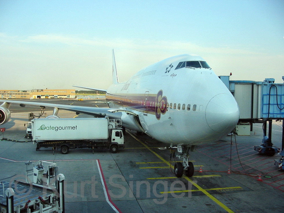 Trotzdem kann ich letztendlich einschlafen. So gegen 9 Uhr morgens, alle schlafen eigentlich noch, macht Hintermann seinen Rolladen hoch, um nachzuschauen, ob der Pilot noch auf dem richtigen Weg ist. Ist er, aber links macht man den Rolladen hoch, schaut man nach, was der guckt. Und dann vorne macht man die Rollläden hoch, was gucken die, keiner sieht was, aber es wirkt wie ein Blitzlichtgewitter. Ich bin wach. Bangkok hat mich gerufen. Frühstueck um zehn, die Zeit spielt schon verrückt.