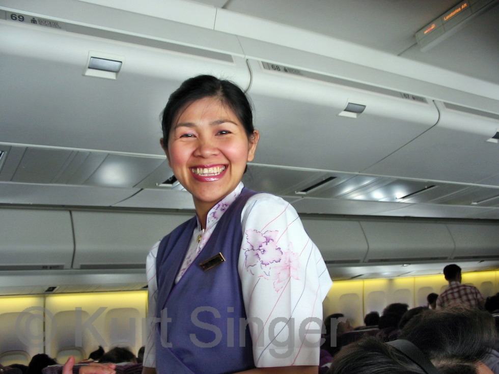 Das wiederum hat zur Folge, dass wir 10 min später bereits eingecheckt haben und uns aus Langeweile schon zum Gate begeben. Dort lernen wir die Crew kennen, die sich wie wir vor dem Gate langweilt. Besonders der Purser hat es mir angetan, ein schon etwas Älterer, der später der Gott für die mitreisenden Kinder sein wird. Seine Mimik ist umwerfend, und fuer jedes der Kinder hat er ein Lächeln, eine neue Grimasse bereit. Auf unserer Seite haben wir eine Airhostess, die mit ihrem bezaubernden Lachen schon geboren worden sein muss.