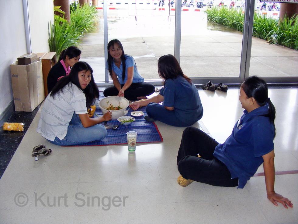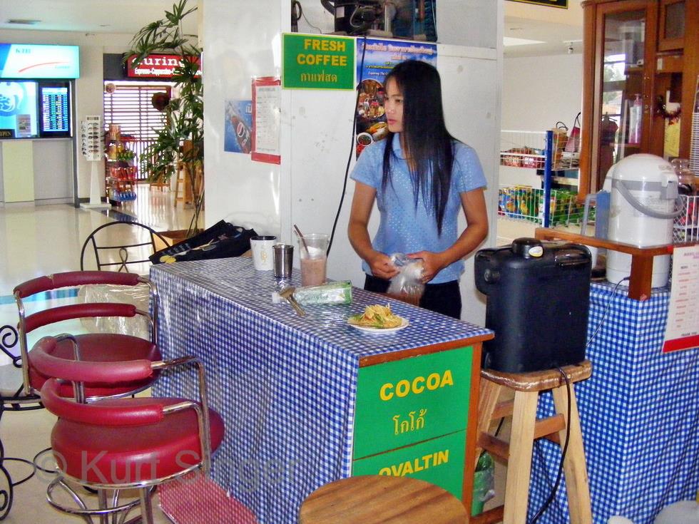 Nun ist der Flughafen von MHS nicht gerade auf Langzeitaufenthalte eingestellt, und es gibt kein Restaurant. Naja, dafür einen Kaffeestand, und ich bestelle mir bei einem netten Mädel einen Kaffee, der auch richtig gut schmeckt. Das Mädel fährt nach der Zubereitung fort, Som Dam herzustellen. Und da ich mich ja bekanntermaßen ein wenig in Thai verständlich ausdrücken kann, reden wir auch bald darüber. Ich komme aus Korat, sie auch. Ob ich Som Dam Essen kann? Klar. Und schon habe ich auch einen Teller davon vor mir stehen, während die Mädels am gedeckten Boden Platz nehmen. So schön kann Reisen sein, so schnell knüpft man schöne, nette und vor allem native (nicht zu verwechseln mit naiven) Kontakte. In der Nähe sitzende Touristen schauen staunend zu. Vielleicht haben auch sie Hunger, aber ob sie auch Som Dam mögen würden ??