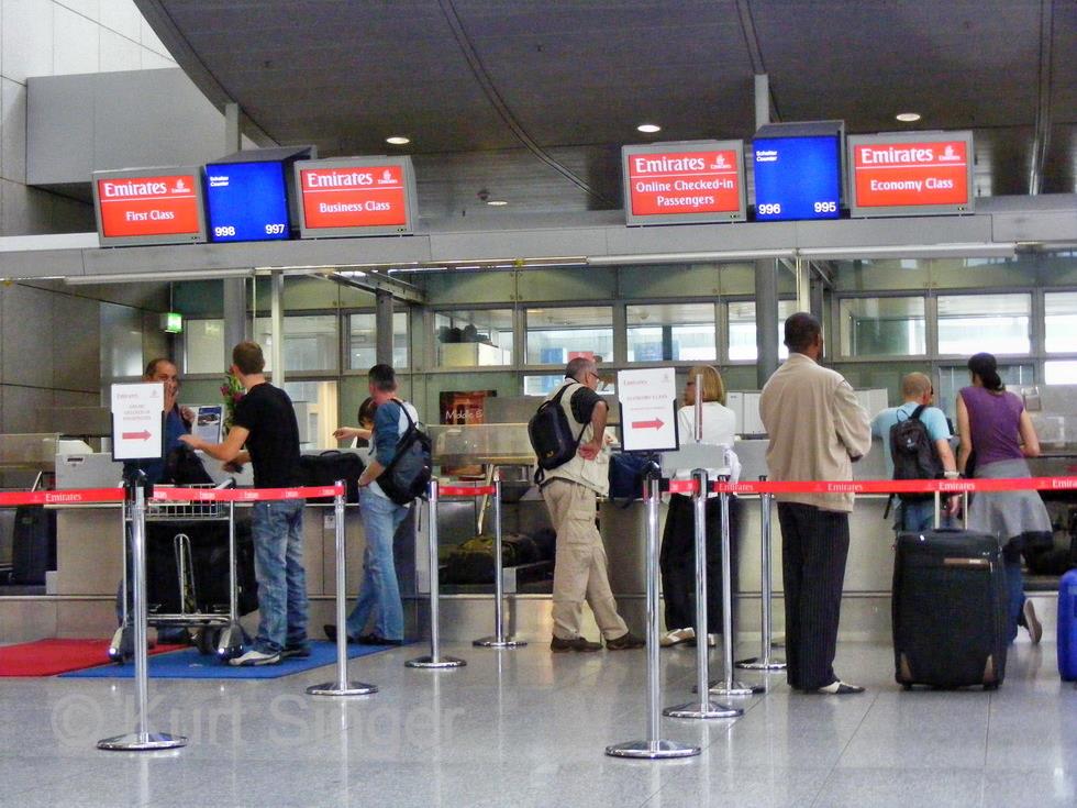 Da das Rail & Fly Ticket der Bahn im Flug inbegriffen ist, nutze ich das auch von Anfang an aus, d.h. ab Bahnhof Ehrenbreitstein. Hier gibts gleich die erste Verspätung – 15 min kommt der Zug später. Aber es ist trotzdem genügend Zeit, den IC zu erreichen. In Frankfurt angekommen ist es ein Leichtes, zum Terminal 2 zu gelangen. Dort zeigt sich der Check-In-Schalter von Emirates erstaunlich leer. Ich checke sofort ein und warte noch ein paar Minuten, damit ich einige Leute am Counter fotografieren kann. Auch am Gate wird es nicht sehr voll, und damit auch im Flieger, einer Boeing B-777, genannt einfach Triple Seven.