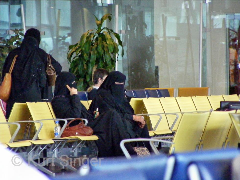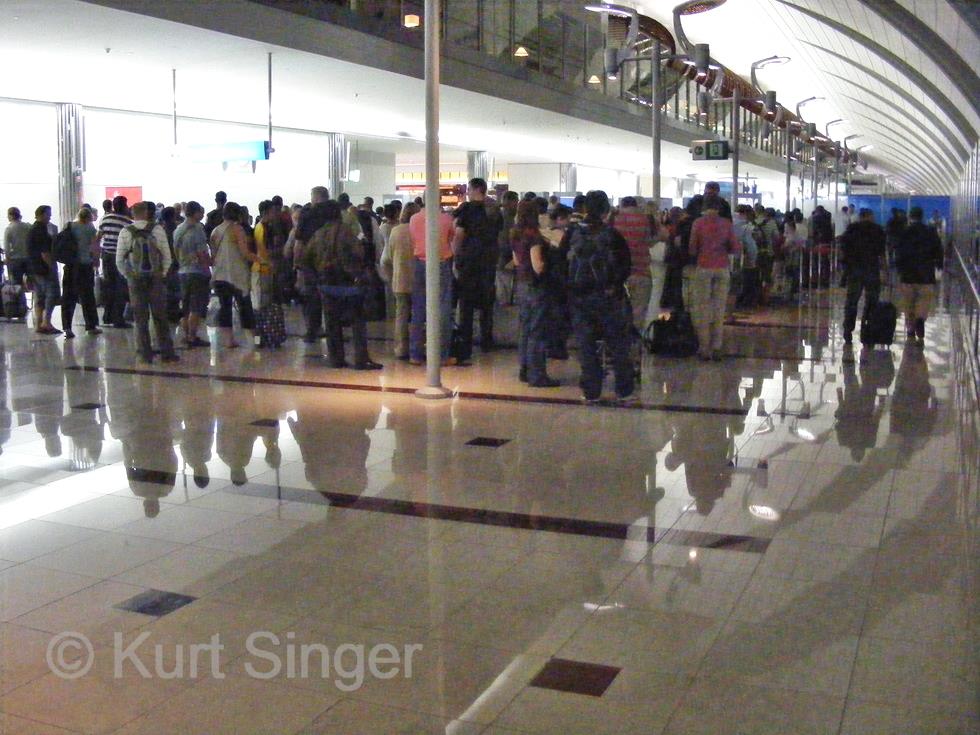 Noch zu den Sitzen: sie sind so ausgelegt, dass nicht einfach nur die Rückenlehne zurück klappt, sondern auch noch die Sitzfläche nach vorne rutscht. Dadurch wird der dahinter sitzende Passagier nicht so eingeengt wie in anderen Flugzeugen. Der Flieger kommt ziemlich pünktlich in Dubai an. 4 Stunden Zeit bis zum Weiterflug, gerade genug, sich den Airport ein wenig von innen anzuschauen. Der Warteraum hier ist auch schon voller, aber doch nicht so voll, wie ich es erwartet hätte.