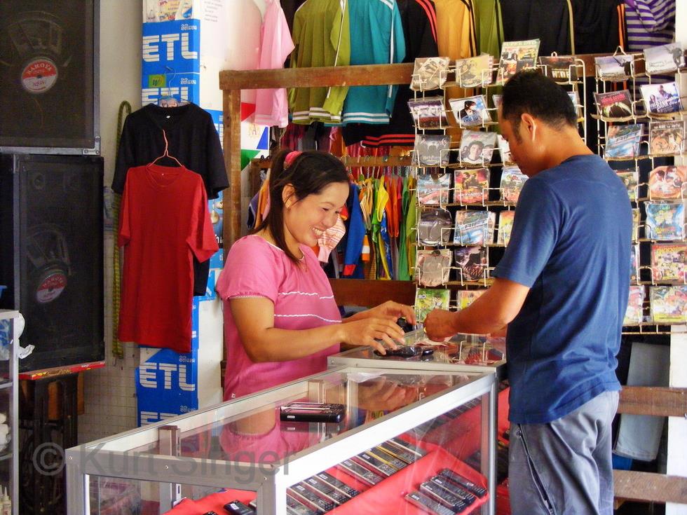 Wir kommen irgendwann an einem kleinen Marktflecken an. Meine Begleiter kaufen auf diesem Markt neben Lebensmitteln auch CDs, z.B. aktuelle thailändische Karaokevideos mit Sek Loso, Thierry und Tata Young für 10 Baht/CD, Handies, Haushaltwaren und allerlei Dinge des täglichen Bedarfs. Und wieder höre ich: alles viel billiger als in Thailand.