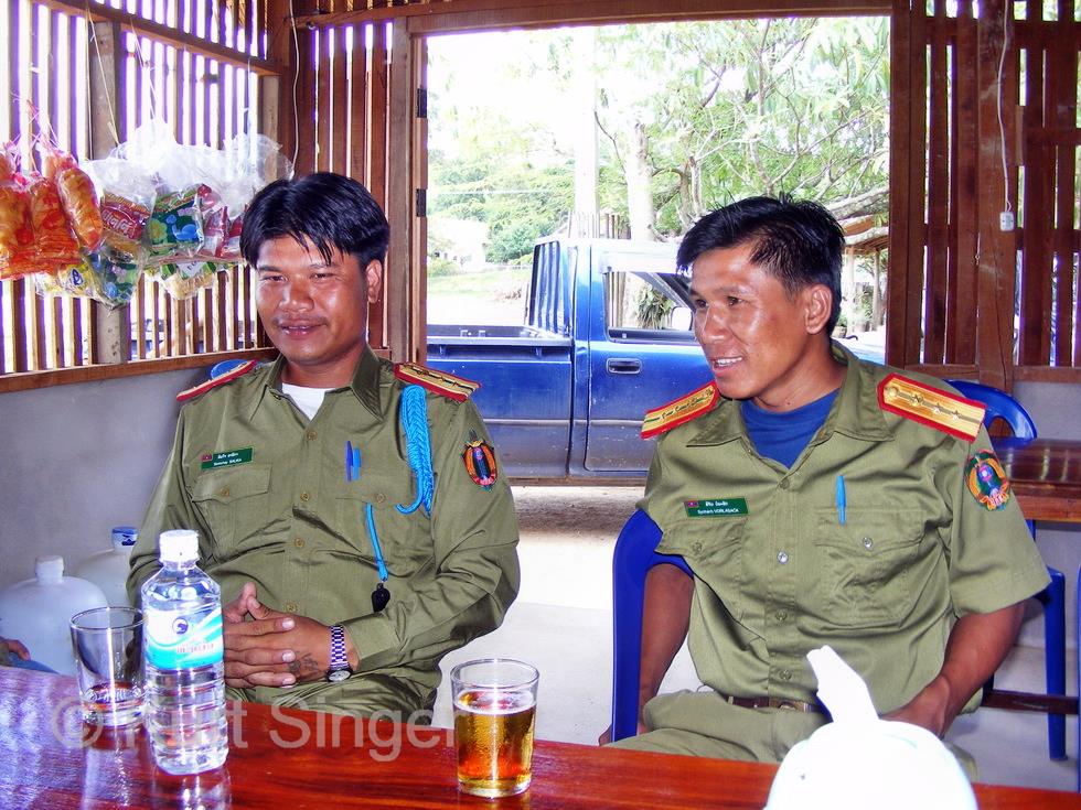 Dieses Mal geht es natürlich nicht im Polizeiwagen, sondern im Privatwagen eines der ortsansässigen Polizisten auf die Fahrt über die Grenze. Die üblichen Ausreiseformalitäten auf der Thaiseite sind schnell erledigt, und wir fahren nach Laos. Der Grenzübertritt erinnert mich dann doch ein wenig an sozialistische und kommunistische Gepflogenheiten. Das Auto fährt bis zu einem Schlagbaum. Die Thais werden gar nicht beachtet, aber ich muß aussteigen und ca 50 m zum Abfertigungsgebäude gehen. Leider darf die Grenze und im Grenzbereich nicht fotografier werden, ebenso dürfen Polizeibeamte und Soldaten auch außerhalb des Grenzbereiches, also im ganzen Land, nicht fotografiert werden (beachte dazu bitte das Foto).
