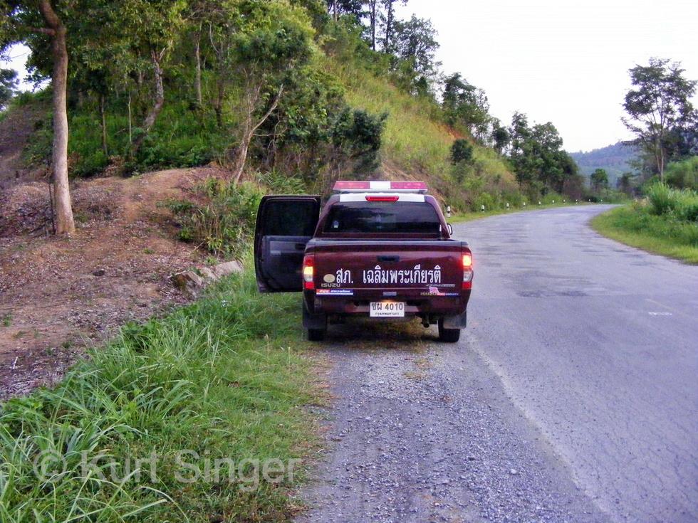 Da Neffe Nan jetzt seinen Dienst antreten muß, bringt mich ein Kollege nach Thung Chang zur Abfahrstelle des Busses. Es ist meine voraussichtlich letzte freiwillige Fahrt in einem thailändischen Polizeiwagen. Der Bus ist ein VX- Class Bus und verfügt über zwei Sitzklassen, eine normale Sitzbreite und eine VIP- Sitzbreite, welche ich natürlich für mich gewählt habe. Die Fahrt bis Chiang Mai kostet 512 Baht.