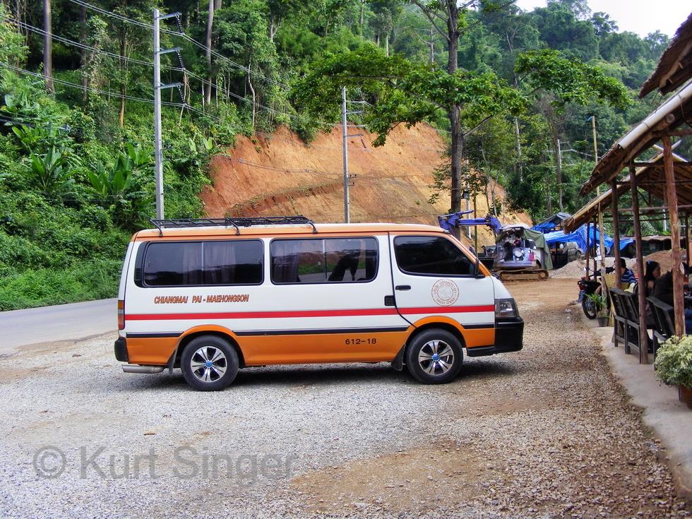 Ich komme ja gerade aus Nan, und im Bus … was war da mit Frühstück?. So schaue ich mich also nach einem geeigneten Lokal um und finde 7eleven. Hole mir dort heißen Kaffee und belegtes Brot und außerdem eine Salbe gegen Mückenstiche, Saem Bat, das beste was es gibt und auch innerhalb weniger Minuten meine eingefangenen Mückenstichfolgen beseitigt. Mein opulentes Frühstück nehme ich im Stehen vor dem Laden ein und schaue mich dann weiter um, denn mein Ziel ist ja Mae Hong Son. Es gibt nur einen Schalter für diese Fahrt. Die Routen führen nördlich über Pai 8 Stunden oder südlich über Mae Sariang 9 Stunden sowie nördlich mit dem Minibus 6 Stunden. Leider macht der Schalter erst kurz vor Abfahrt auf, und bevor ich mich anstellen kann sind die besten Plätze im Minibus schon vergeben.
