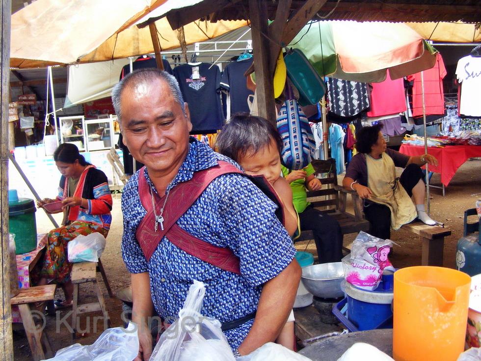 Richtig interessant wird es bei einem Halt auf einem Markt. Nicht nur, weil er schön anzusehen ist, sondern auch weil er zeigt, daß die Bergvölker nicht hinter dem Berg leben, und daß Männer durchaus auch dazu geeignet sind, auf Kinder aufzupassen.