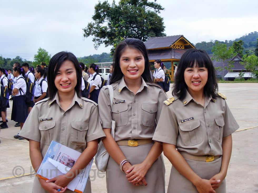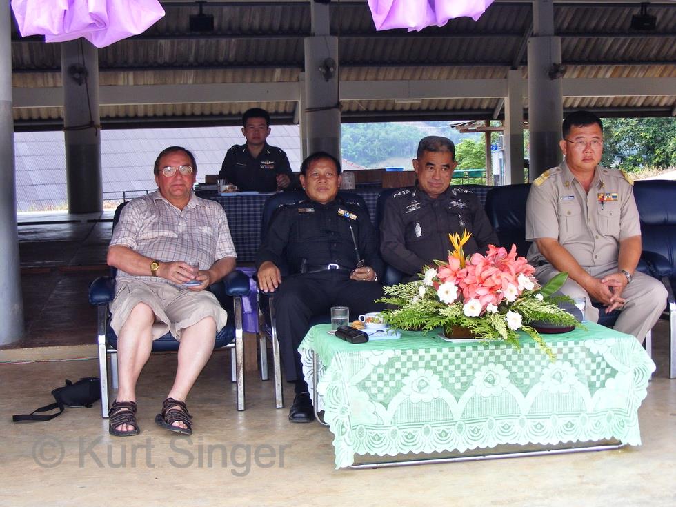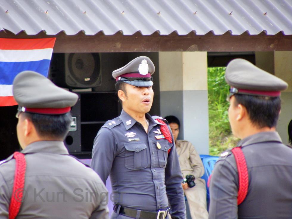 Nun wird es aber Zeit, auf den Schulplatz zu gehen. Zu meiner Überraschung steht dann der Schulleiter, wie ich später erfahre, vor mir, begrüßt mich nett und höflich im Kreise der Lehrerschaft und bittet mich, ganz ungezwungen überall hinzugehen und Fotos zu machen. Ja, ich sei ja durch Herrn Adinan (mein Neffe Nan) angekündigt und solle auch der Inspektion der Polizeitruppe durch den Polizeichef der Provinz Nan teilnehmen, welche dann später stattfindet.