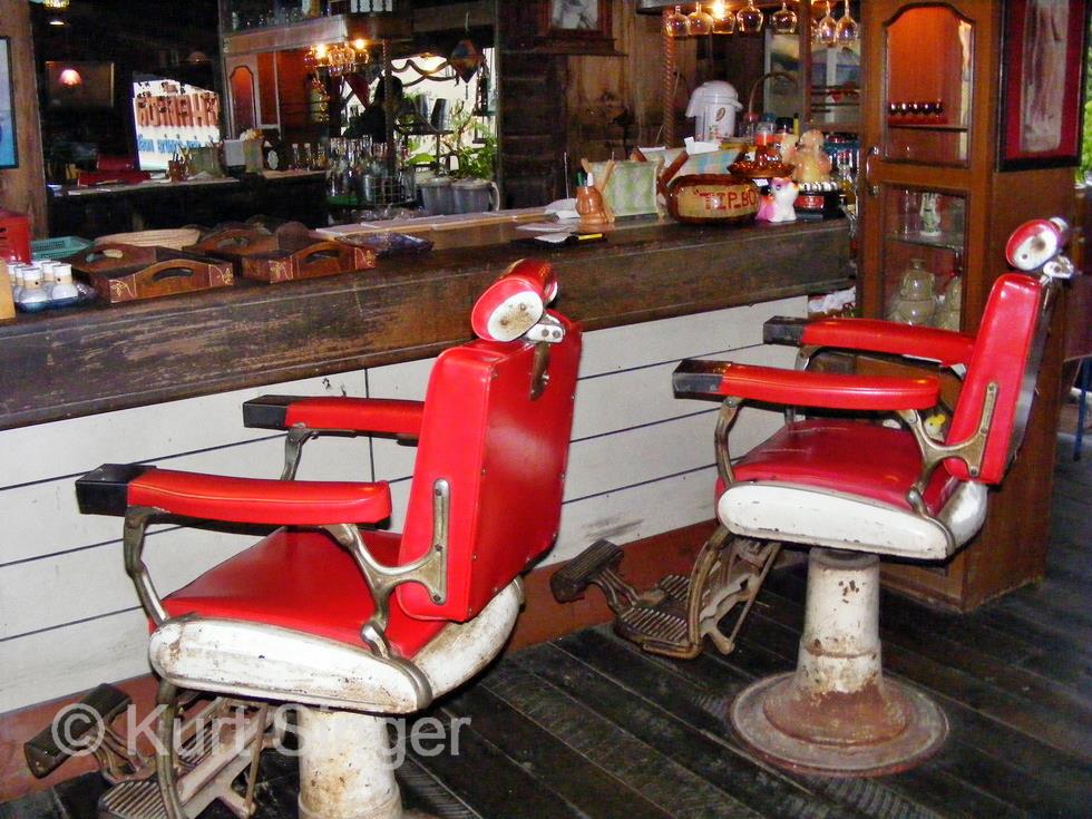 Ich jedoch habe keine Chance, will ich nicht völlig durchnässt am Tisch sitzen. Ich sehe mich um und kaufe für 25 Baht einen Regenumhang, der mich völlig schützt. Schade oder auch nicht, daß mich niemand fotografieren kann. Das ausgesuchte Restaurant bietet wirklich gutes Essen. Eine kleine Kuriosität: als Barhocker dienen alte Frisörsessel.