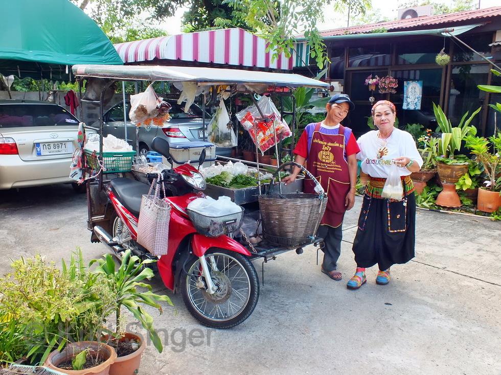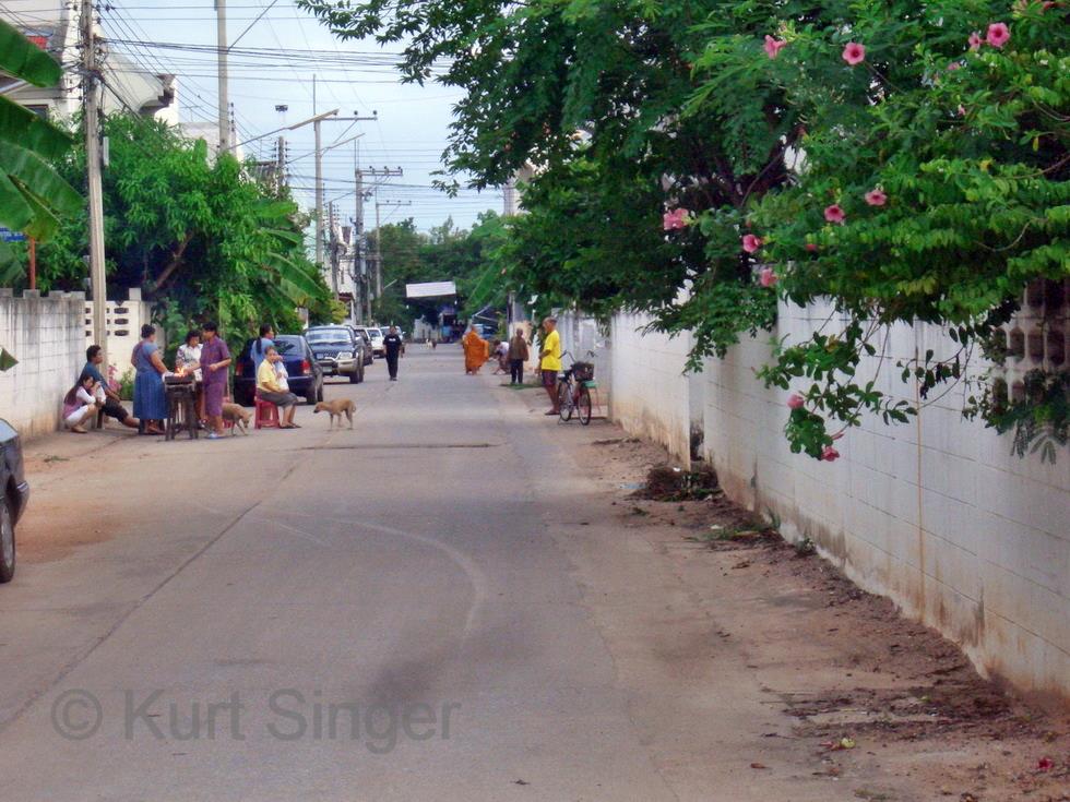 Beim Nachhauseweg vom Tesco, der ja ganz in der Nähe unseres Hauses ist und ich den Weg somit zu Fuss machen kann, fangen meine Ueberlegungen schon an. Zunächst der Gedanke, wie ich mich mit Handschuhen und Mundschutz, was mir dringend bei der Arbeit empfohlen wurde, so mache, und als nächste Ueberlegung, welche der Tüten die schwerere sei. Auf dem Weg nämlich lauern in aller Regel mehrere Hunde, die jeden Vorbeikommenden ankläffen, manchmal auch nachlaufen und ganz schön dicht herankommen. Ich habe immer etwas in der Hand, und so plane ich die Tüte mit dem Reinigungsmittel nach rechts, um sie gegebenenfalls als Hundeabwehrwaffe zu benutzen. Doch ich bin gerade beim Tütenwechsel, als ein schmächtiges Moped neben mir anhält, und ein noch schmächtigeres Mädel darauf nach meinem Weg fragt. Soi 12, ist meine Antwort, und sie bedeutet mir, aufzusteigen. Gerne lasse ich mich darauf ein und wünsche, der Weg möge doch noch doppelt so weit sein. Wir fahren dann auch an ihrem Haus vorbei, und ihre Familie schaut ebenso verblüfft darein wie ich, machen noch scherzhafte Bemerkungen zum kleinen Moped und dem grossen Farang darauf, wohl wissend, dass ich sie verstehe. Unbeirrt setzen wir unsere Fahrt fort, und an Soi 12 steige ich ab. Danke, mai pen rai, ein kurzes Winken und sie fährt davon. Ein immer noch verblüffter Farang geht nach Hause, das Putzmittel immer noch in der Tüte der linken Hand. Ich will gerade das Tor aufschliessen, denn ich habe mich dem Verbarrikadierungswahn der Thais angeschlossen und das Hoftor, die Haustür und die Fliegenschutztür abgeschlossen, als die Nachbarin gegenüber mich ruft. Sie hat eine Schale mit etwas in der Hand, was wie gefüllte Croissants aussieht und reicht mir diese. Die Frage nach dem Preis beantwortet sie mit 50 Baht, und ich habe was vermutlich Leckeres gekauft, worin ich natürlich sofort sicher sein will und gleich eines verspeise. Ja, lecker, und es sind gefuellte Croissants.