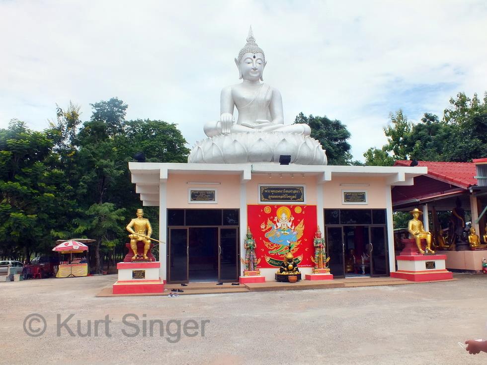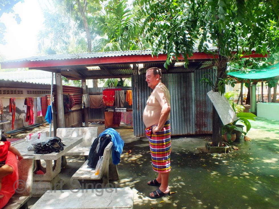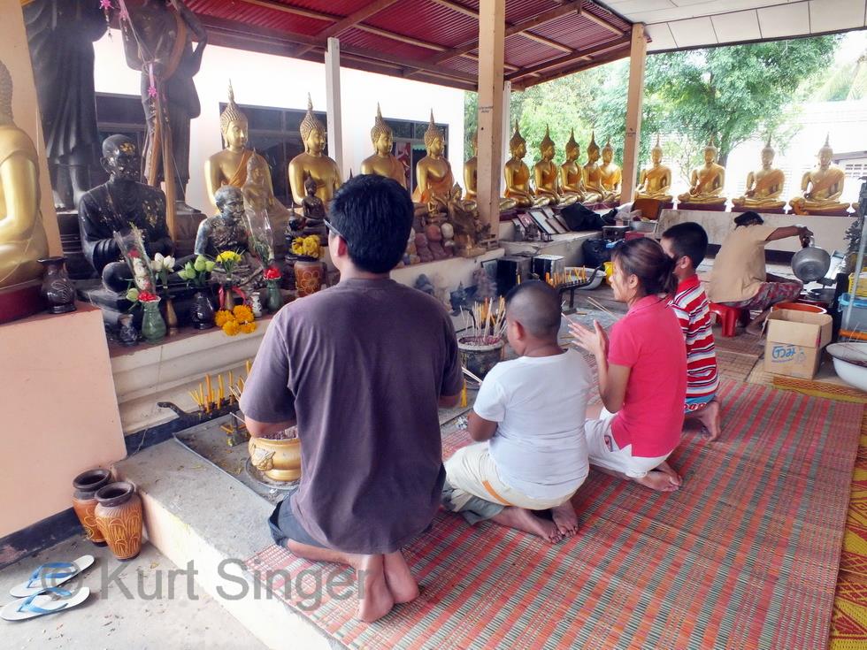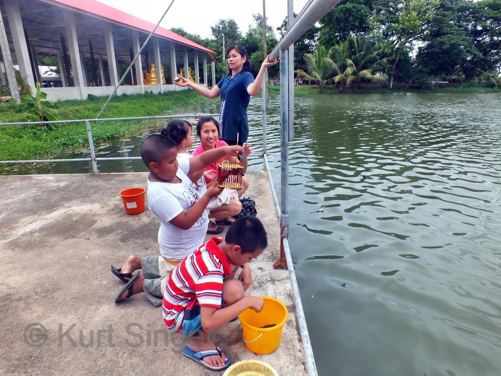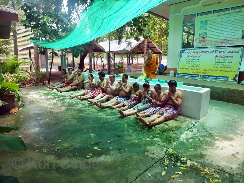 Am Sonntag hat mich die ganze Korater Familie abgeholt zum Tambun. Und so fahren wir mit Leks neuem Pickup, 6 Erwachsene, 3 Kinder und 1 Baby, zum Wat Samanmit im Amphoe Chaloem Phra Khiat zum Duschen. ??? Das Wat ist bekannt für eine besondere Zeremonie. Aber der Reihe nach. Die älteren Kinder übergeben in der Tambunzeremonie jedes einen vorher gekauften und speziell dafür zurechtgemachten Eimer mit Gaben für die Mönche. Danach erfolgt der Wassersegen des Mönchs und die Tuchzeremonie, und dann ist die Essenszeit der Mönche gekommen, welche diese einhalten müssen. Wir haben also erst einmal Pause und können uns gemütlich zunächst im Wat umsehen und und dann zur Reinigungszeremonie umziehen. Der Andrang dafür ist gross, und als der Mönch beginnt, uns mit dem Wasser zu übergiessen habe ich den Eindruck, man habe vorher noch viele Eiswürfel ins Wasser getan, es kommt mir jedenfalls eiskalt vor, was aber nicht wirklich unangenehm ist, denn die Temparatur dürfte schon weit über 30 Grad liegen. So gereinigt werden noch einige Vögel, eine Schildkröte und zwei kleine Aale freigelassen und so das Karma aller in einem gemeinsamen Tambun von Kindern und Erwachsenen positiv beeinflusst.